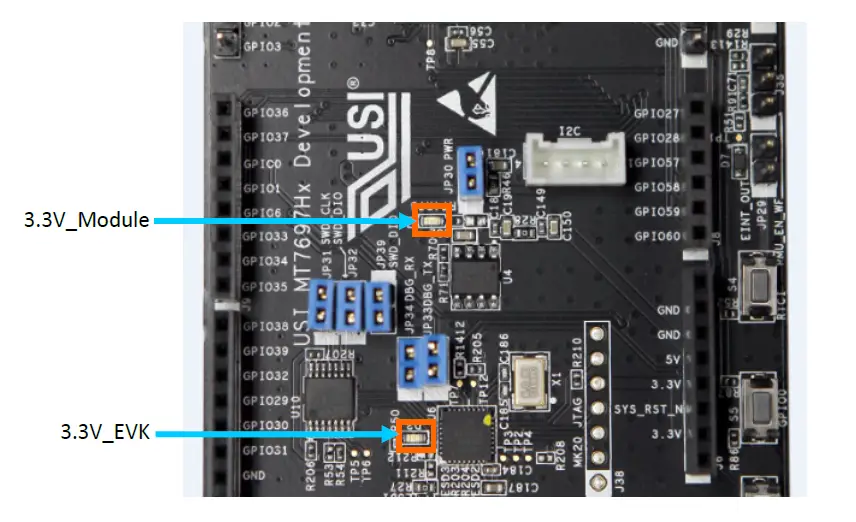 - Pin header (JP30) for current measurements (Remove jumper, 3V3 is going through a 1ohm resistor)