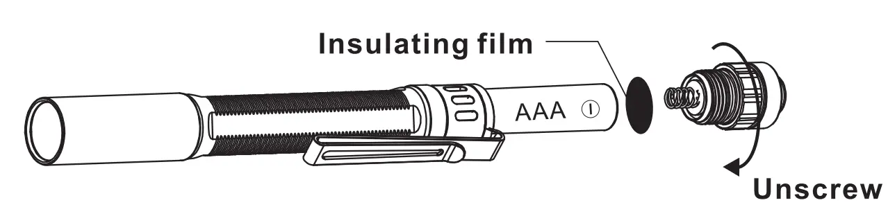 Before first use, unscrew the tail cap and remove the insulating film
