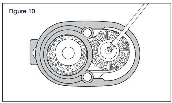 - Place mop over gear until it locks in place. Pump foot pedal with foot until mop is saturated. Repeat process to clean mop head. (See Figure 10)