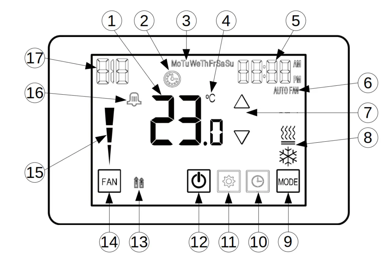 button allows to completely turn off the system. Then, no heating, cooling or ventilation command will be sent to the system.