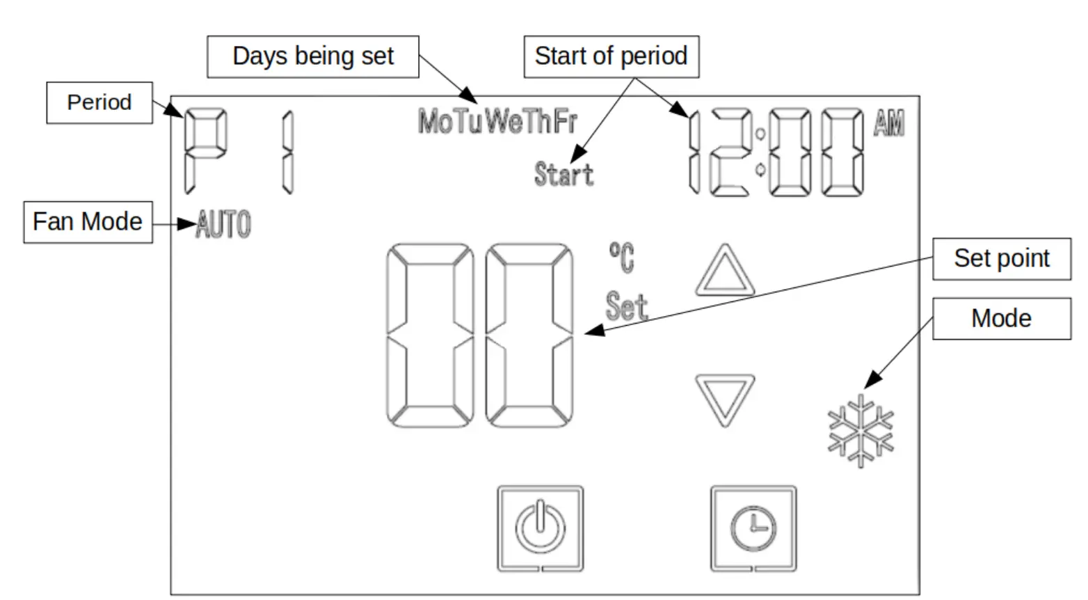 The blinking cursor will cycle through these parameters for all periods, and for all day groups. Once the schedule is set, to enter this mode press and hold