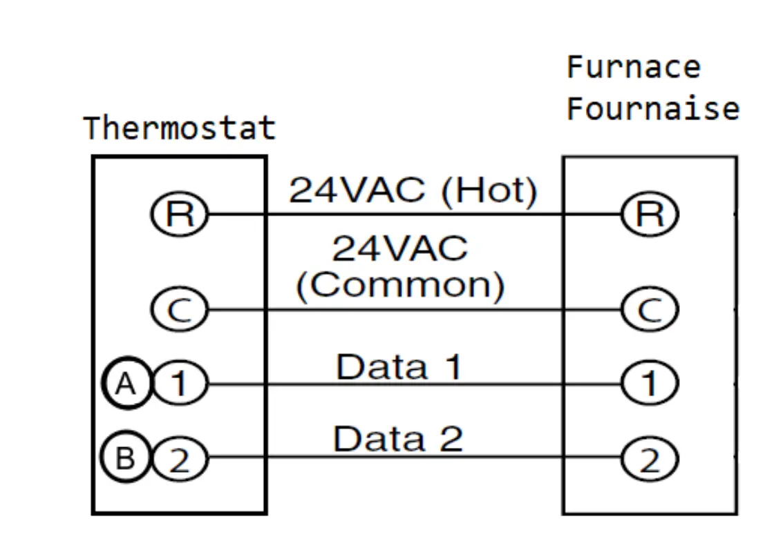 Each communicating device in the system has a four wire connection labelled (R, C, 1, 2). Each R, C, 1, and 2 terminals must be wired consistently. Maximum length from the thermostat to the indoor unit is 100 feet.