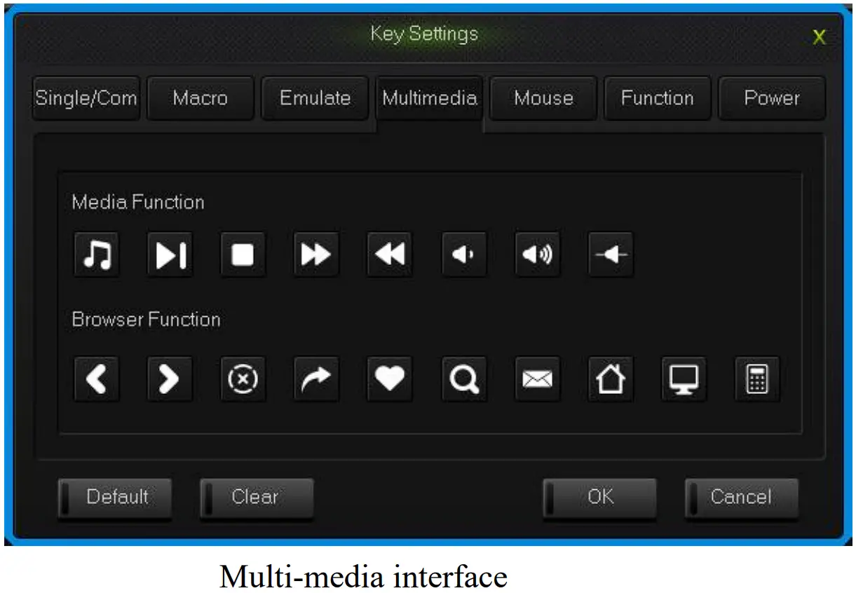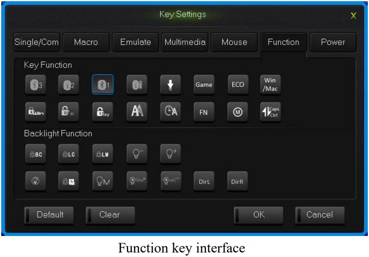 - Single click the key you need to configure, click “Funcion” in the dialog box of “key Settings” that pops out;