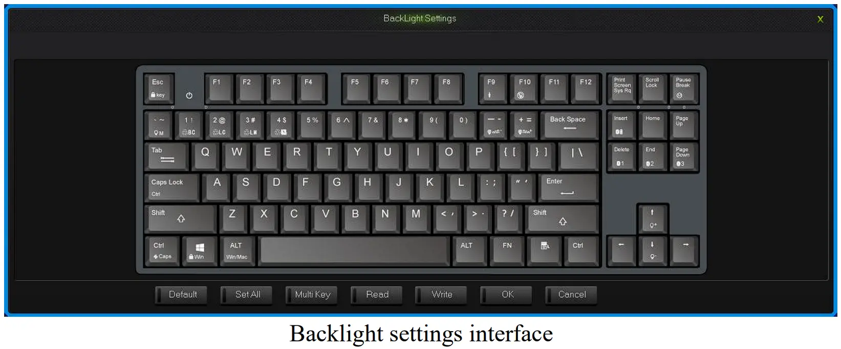 Single press on any key on the backlight interface, choose the color in the dialog box of “color” that pops out and confirm. Then fast set up the chosen key color as the chosen color.