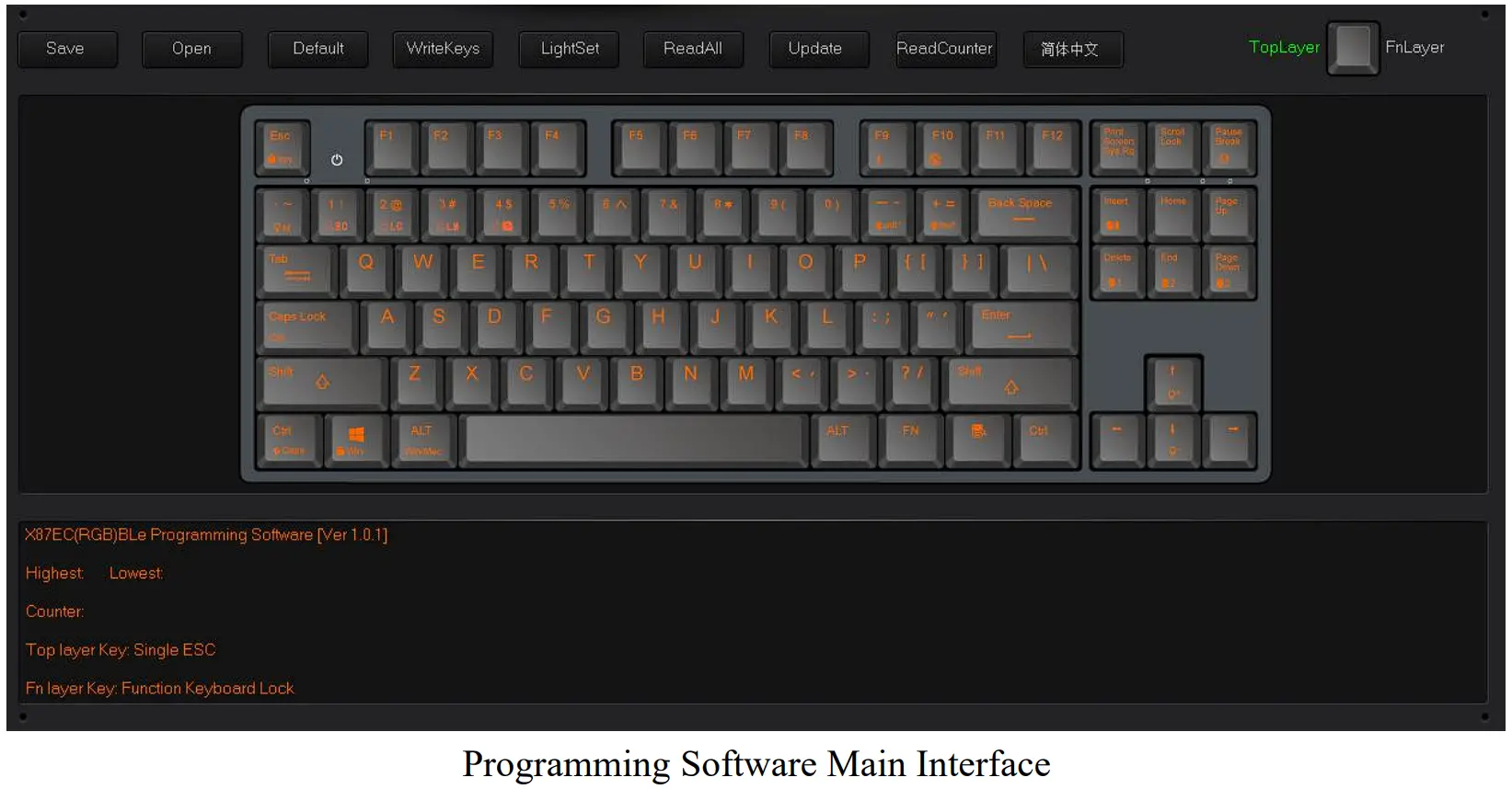 | FN+ | ~` | = | Specific lights | Programming software definitions, press to in,Shutdown memory. |