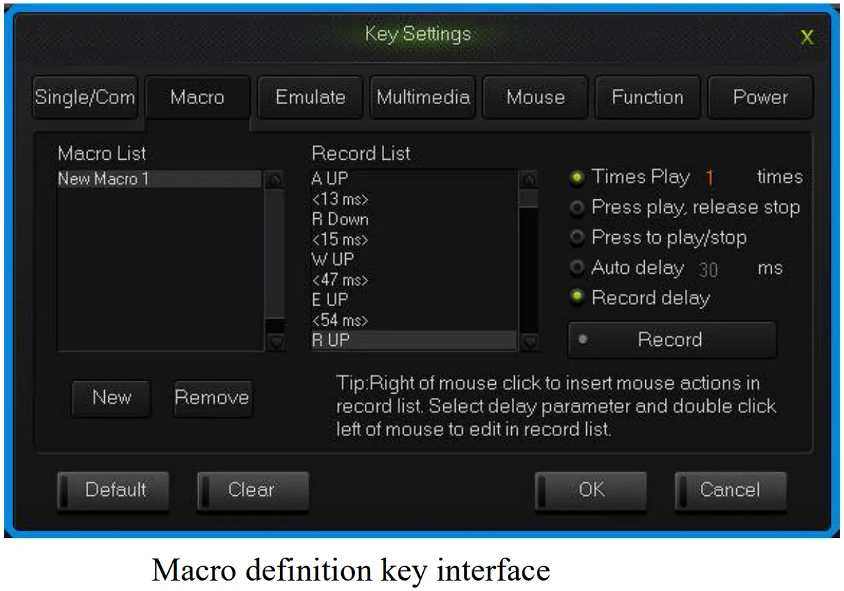 - Choose a new macro, selected the style of output and automatic delay in the macro edit on the right side, then click “Record”, type the keys that need to be define on the keyboard and click “Stop Rec”;