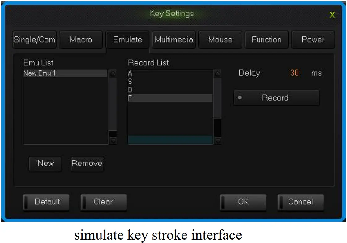 - Choose a new-built key stroke, set up the key stroke time in the edit list on the right side, single click “Record”, type in the keys that need define, then click “Stop Rec”, simulate key stroke can record six at most;