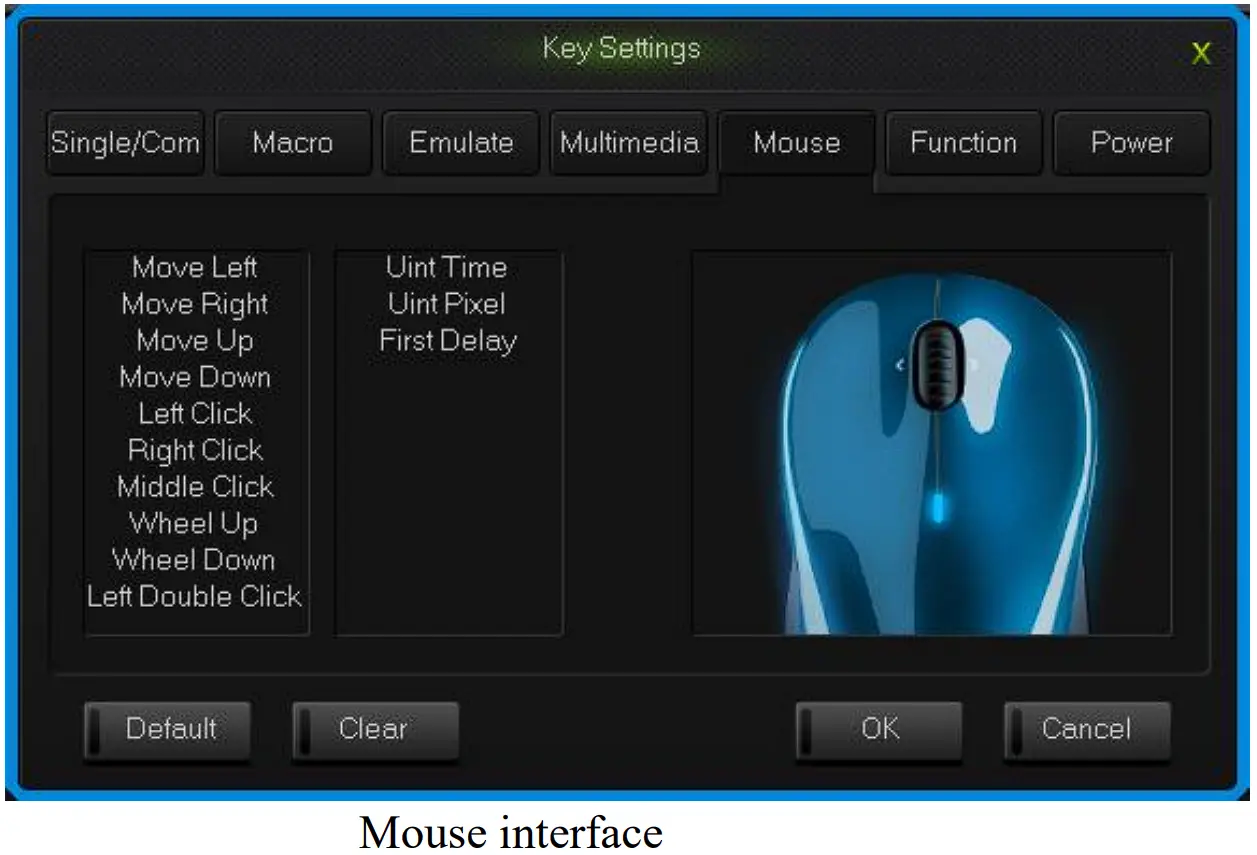 - Single click the key you need to configure, click “Mouse” in the dialog box of “Key Settings” that pops out;