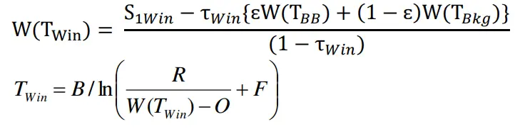 - Calculate the window temperature with the following equations. The flux due to the window temperature W(TWin) must first be calculated before converting to temperature TWin with the RBFO parameters that were calibrated at the factory on a per-camera basis; the RBFO parameters can be read from the camera software via the