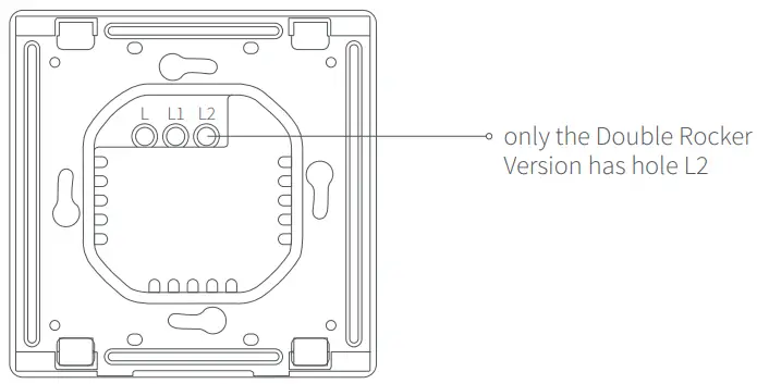 - Loosen the terminal screw on the back of the switch with the screwdriver, connect the live wire to the hole L, and the load (light) wire to the hole L1 and L2 (corresponding to the left and right buttons respectively), and tighten the terminal screws after confirming that the wiring is correct.