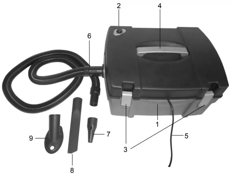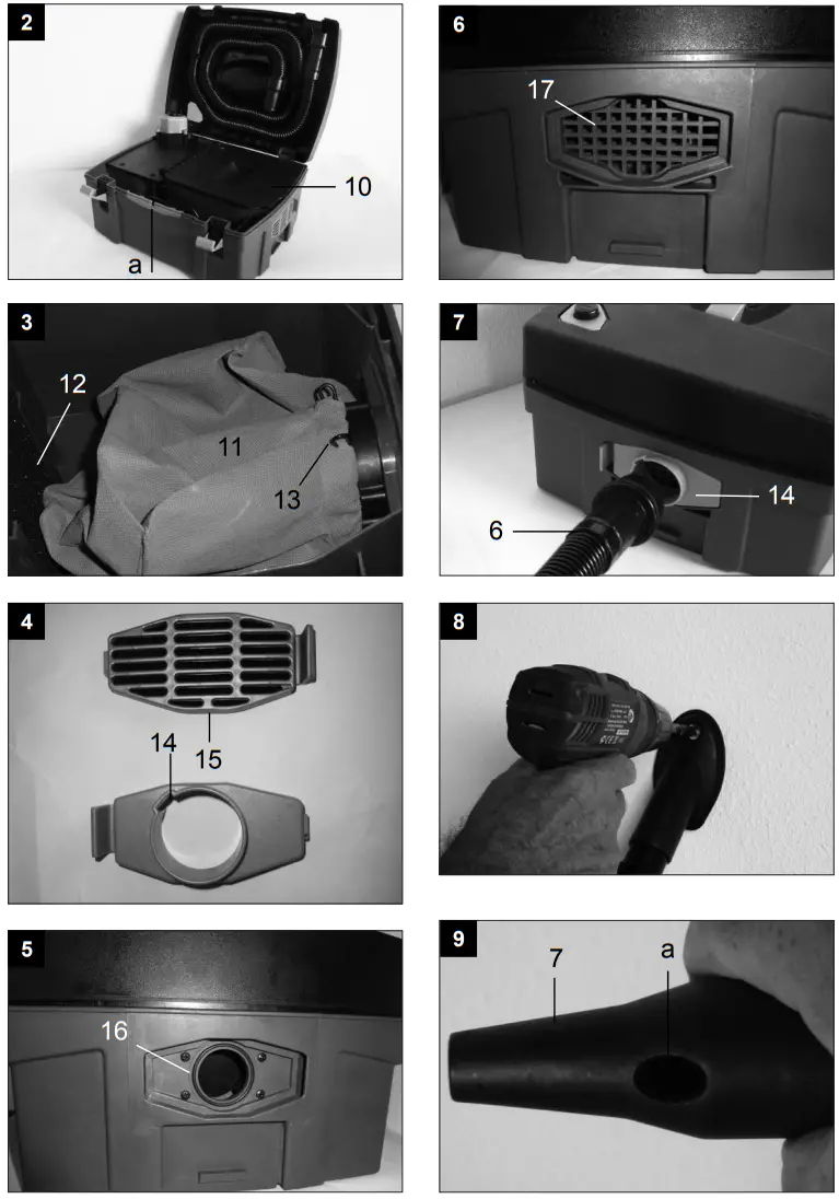 | 1 Case 2 On/off switch 3 Clamp for the case cover 4 Carrying handle 5 Power cable 6 Suction hose 7 Suction/blowing nozzle 8 Suction nozzle, flat | 9 Borehole-suction nozzle 10 Lid for dust bag 11 Dust bag 12 Dust filter 13 Clamping bracket 14 Suction nozzle 15 Suction grating 16 Connector for suction 17 Connector for blowing |