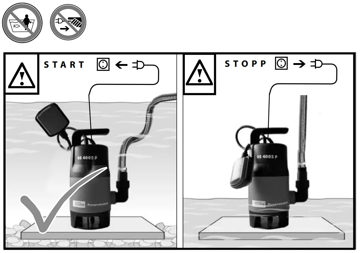 - Do not grab the feeder cable, plunge the pump, lift or carry it while it is connected to the grid!