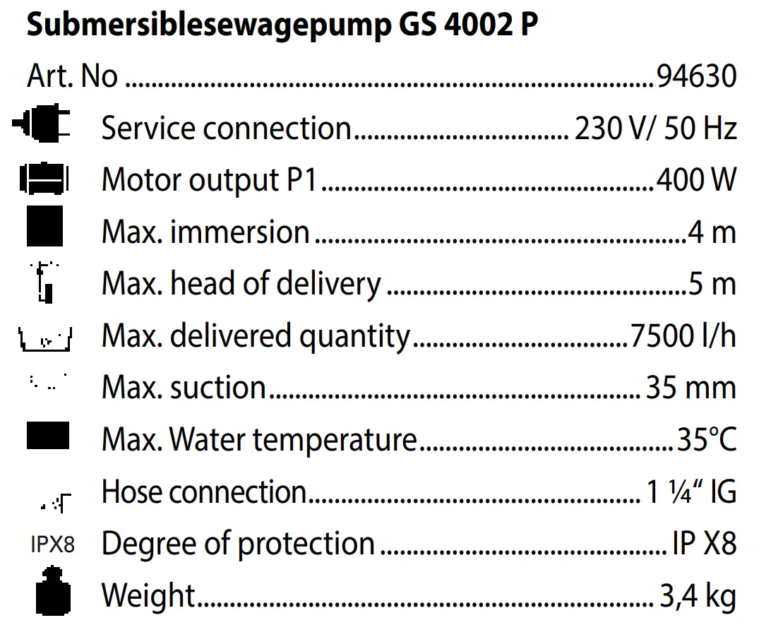 Do not leave the pump unattended while in operation in order to prevent subsequent damages caused by eventual malfunctions. Make sure to disconnect the device from the grid if you do not plan on using it.- The temperature of the drained liquid must not exceed +35 °C.