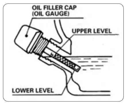 - If oil level is below the lower level line, refill with suitable oil (see table below) to upper level line. Do not screw in the oil filler cap when checking oil level