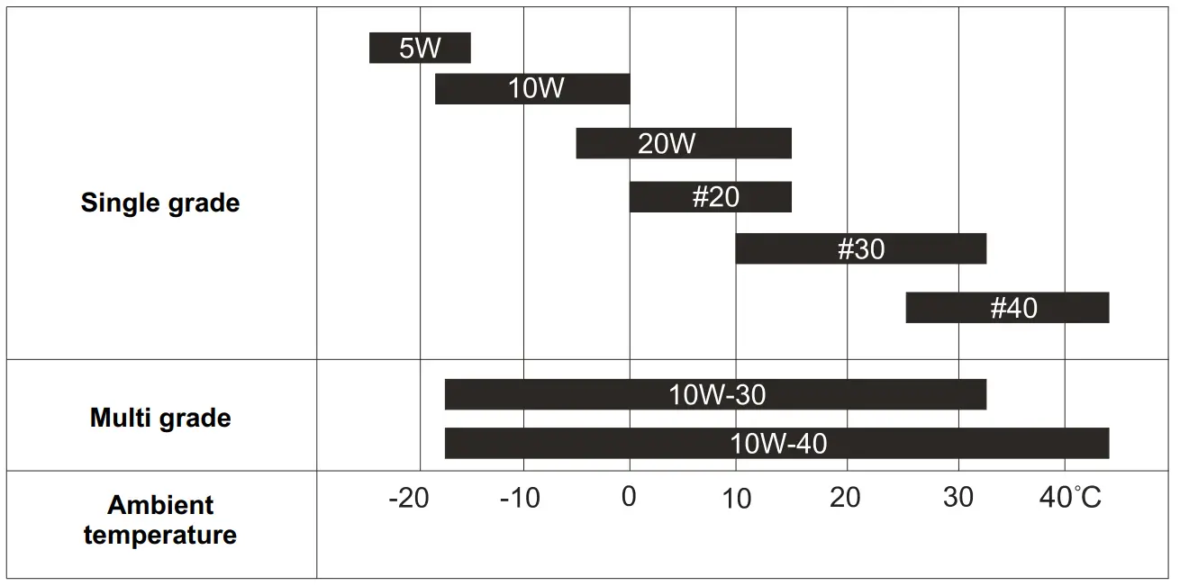 Use fresh and high quality lubricating oil to the specified quantity. If contaminated or deteriorated oil is used or the quantity of the engine oil is not sufficient, the engine damage will result and its life will be greatly shortened.