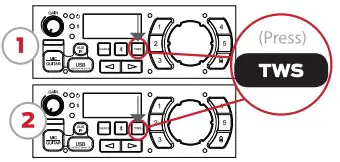 - Press and hold the TWS pairing button to Transfer speaker for 3 s to activate TWS pairing.