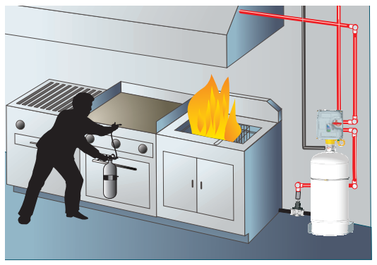 - An actuating device automatically opens the container valve, allowing the wet agent solution, to dis-charge through pipe and nozzles, suppressing fire through a patented process.