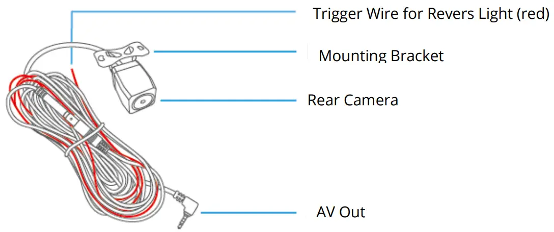 Step 3: Attach the AV Out connecter of the Rear Camera Kit with the AV In port of the Mirror Dash Camera, then snake the black cable of the Rear Camera Kit through the body of your vehicle to the rear of it.