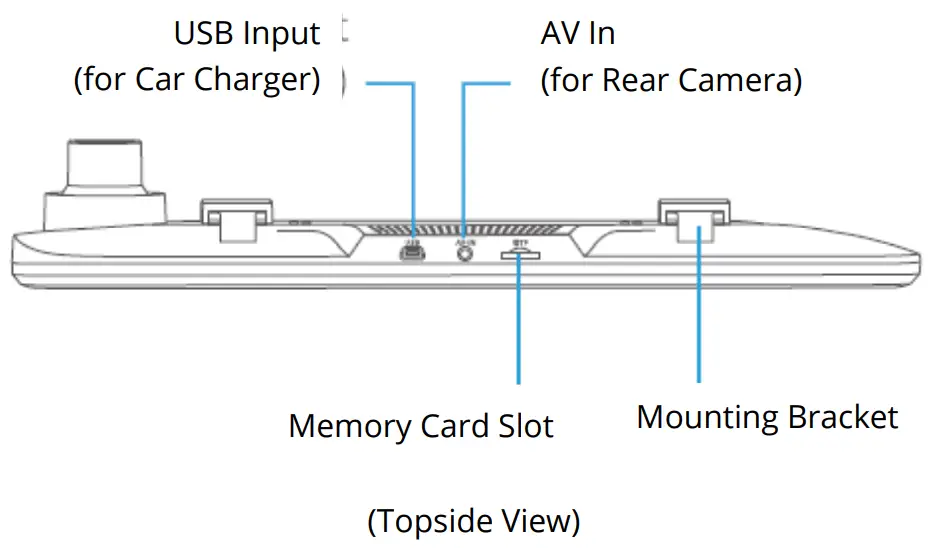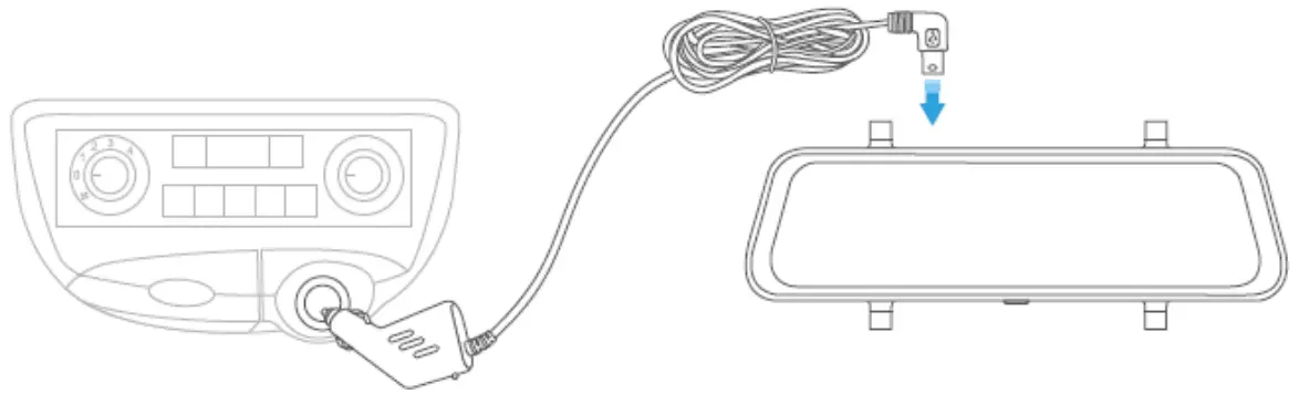 Step 2: Connect one end of the Card Charger cable to the USB Input port on the topside of Mirror Dash Camera. Plug the other end of the Car Charger cable to the Cigarette Lighter Receptacle in the vehicle.