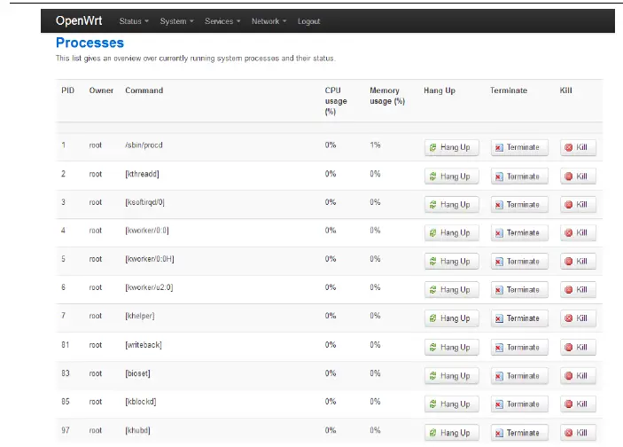 Click the processes, you could check an overview over currently running system processes and their status. Such as CPU usage, Memory usage. You could hang up ,terminate or even kill the program, depends on your requirements. As the 4.2.6