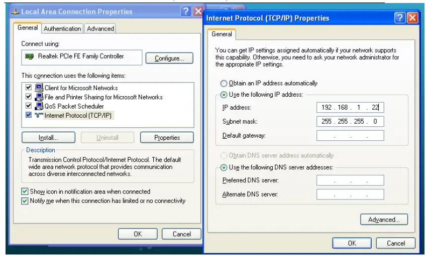 Second, set the computer TCP/IP in to static IP 192.168.1.X ( X means any number between 2 to 255 ) and Subnet mask into 255.255.255.0