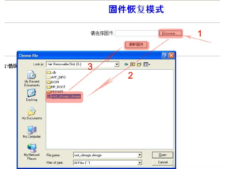 Click “ Browser ” button find the firmware “root _uImage. uImage” from your computer, double click “root _uImage.uImage” to hang on it. Then click “Recovery Mode ”to start uploading