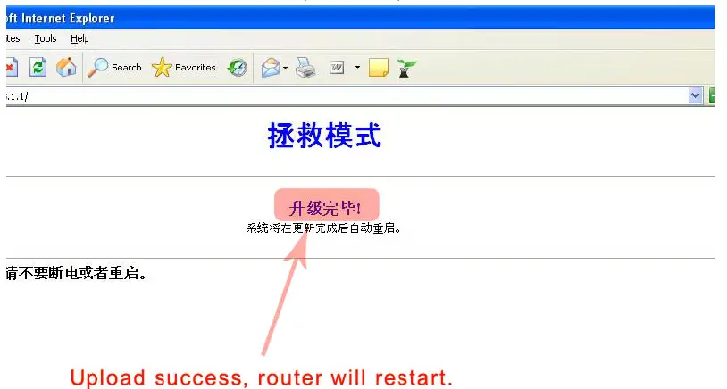 About 100seconds, the file upload success will show “升级完毕” as below picture show. And the router will automatic restart