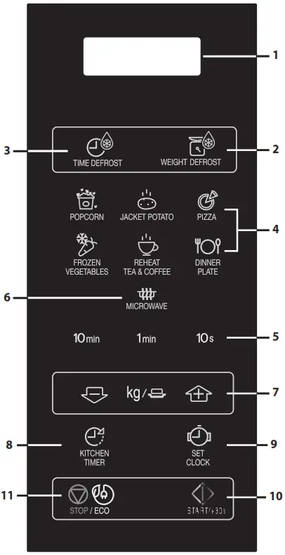 In standby mode, press the “ECO” button once, the LED display will be off and the microwave oven enters ECO mode, any operation can light the LED display again, and the microwave oven will return to standby mode.![]()