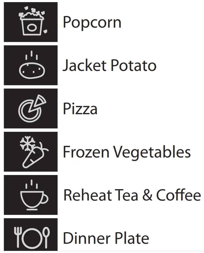 | Popcorn | 0.05kg, 0.1kg | Place the popcorn bag directly on the turntable (Please see the note below: ‘Important Information About Microwave Popcorn Feature’) |