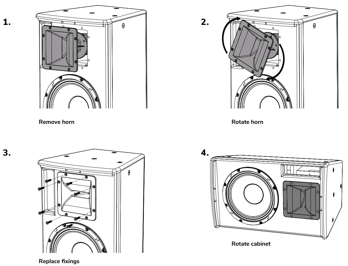 These specifications refer to the loudspeaker ex-factory. With the loudspeaker in portrait, the horn is fitted to deliver coverage as shown in the table above. If you intend to mount your Cuboid in landscape mode (when suspending horizontally from ceiling for instance), consider rotating the horn as shown in the following images: