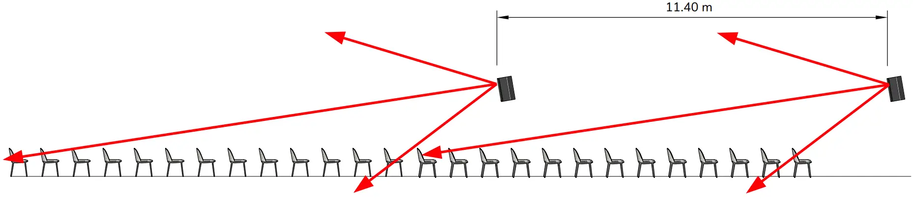 Because of this level drop over distance, in larger rooms it’s well worth considering additional loudspeakers to counter this effect, maintaining volume and intelligibility. In this case, it is important that the second row of loudspeakers down the room are delayed to match the arrival of the sound from the first pair of speakers, as shown above.