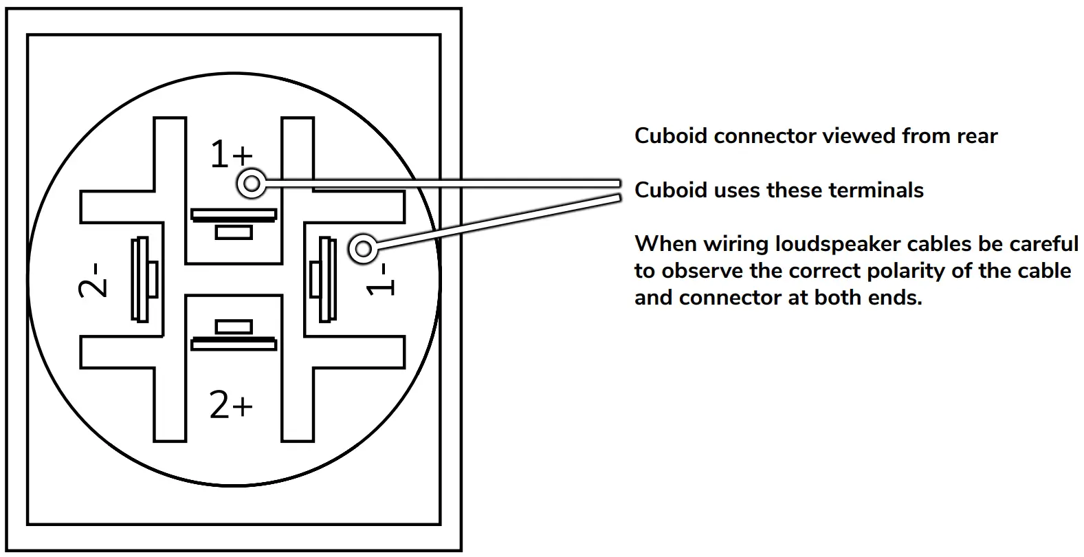 Cuboid uses only pins 1+ and 1-. These are linked across the two connectors, providing a useful link to a second loudspeaker of the same model. No more than two Cuboids should be connected to a single amplifier channel.