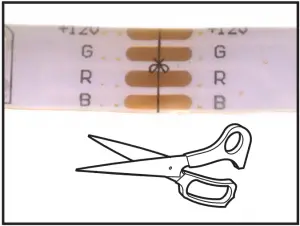 If you would like to shorten the LED strip simply cut across the copper contacts with scissors as shown below.