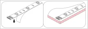 To stick the LED strip onto a surface, simply peel off the paper sticky underside as shown below. Before installation of the LED strip please ensure that you wipe the surface with an Alcohol prep pad (not supplied) to make sure it is free of dust and grease. Press and hold the LED in position for at least 60 seconds for maximum adhesion.