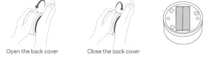 (1) Put the remote control with the anti-slip pad facing downwards on your palm, then hold to turn the remote control counterclockwise with another hand to open the back cover.