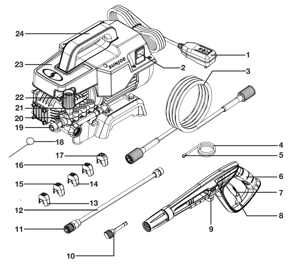 WARNING! ALWAYS use only authorized Snow Joe® + Sun Joe® replacement parts and accessories. NEVER use replacement parts or accessories that are not intended for use with this electric pressure washer. Contact Snow Joe® + Sun Joe® if you are unsure whether it is safe to use a particular replacement part or accessory with your pressure washer. The use of any other attachment or accessory can be dangerous and could cause injury or mechanical damage.