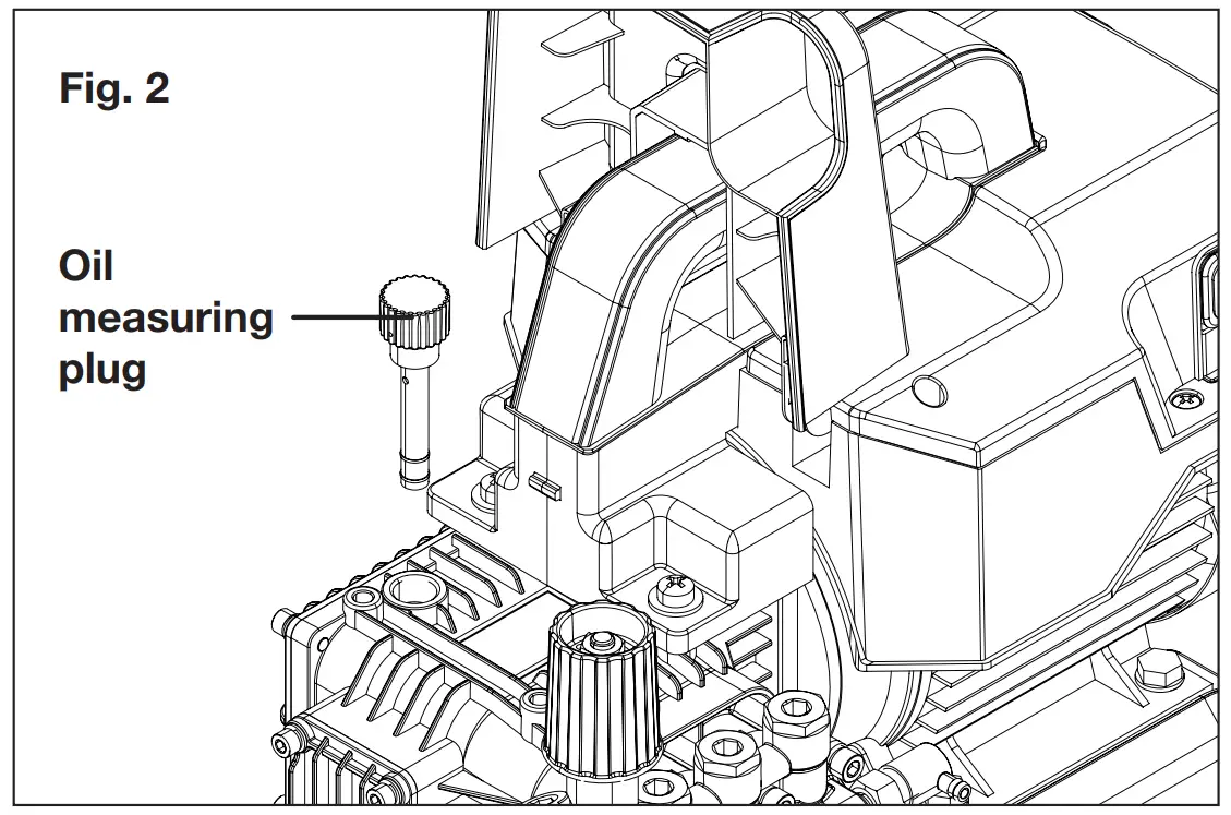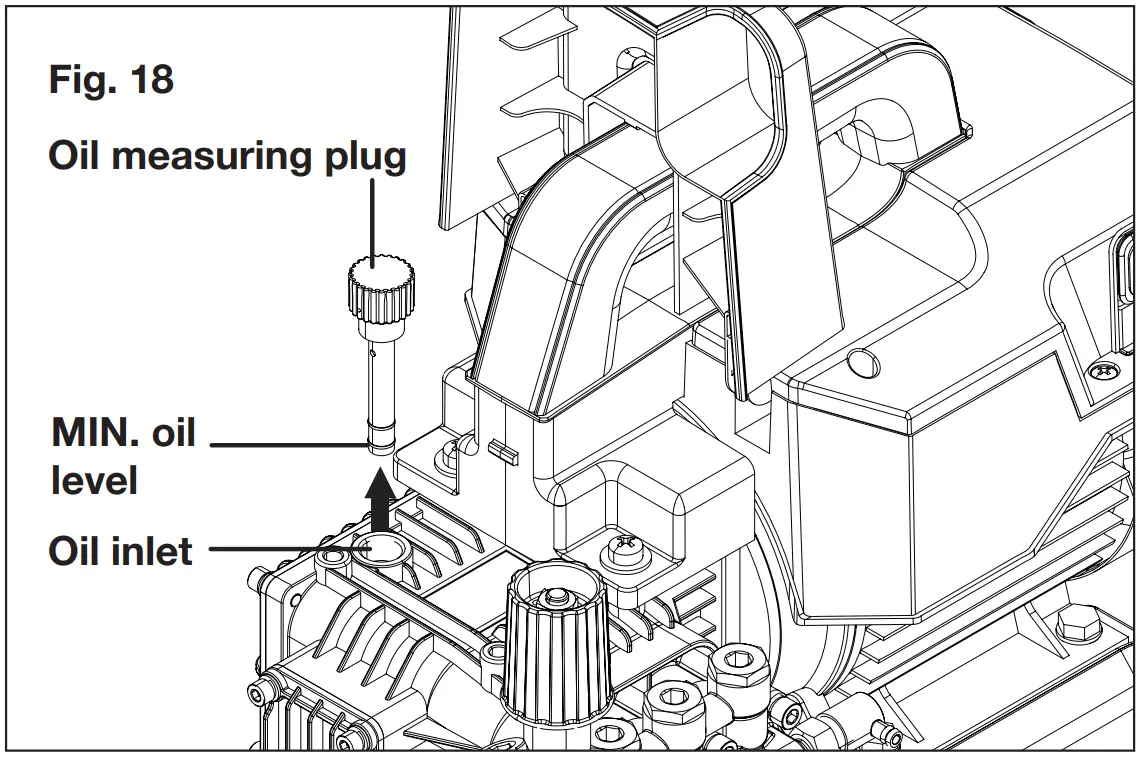 - Check the oil level with the oil measuring plug. Make sure the oil level is above the MIN on plug (Fig. 18).
