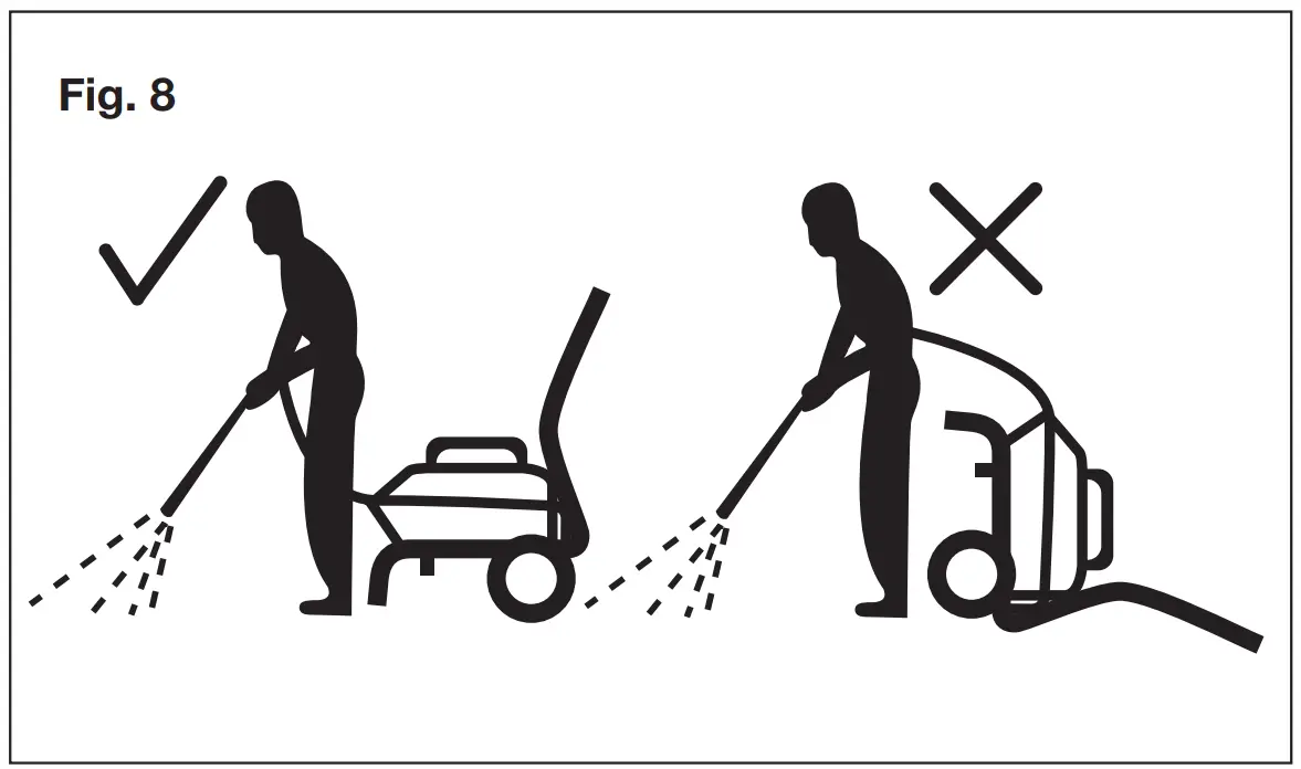 - Do not direct the jet at yourself or others in order to clean clothes or footwear.