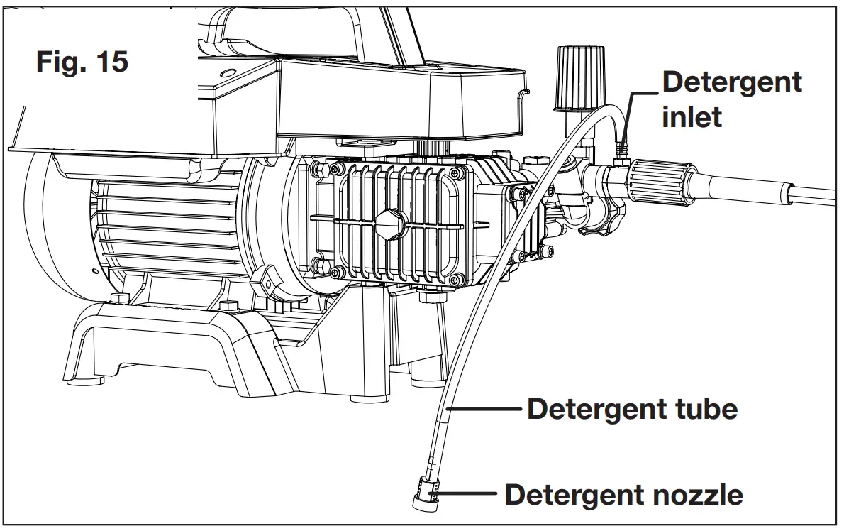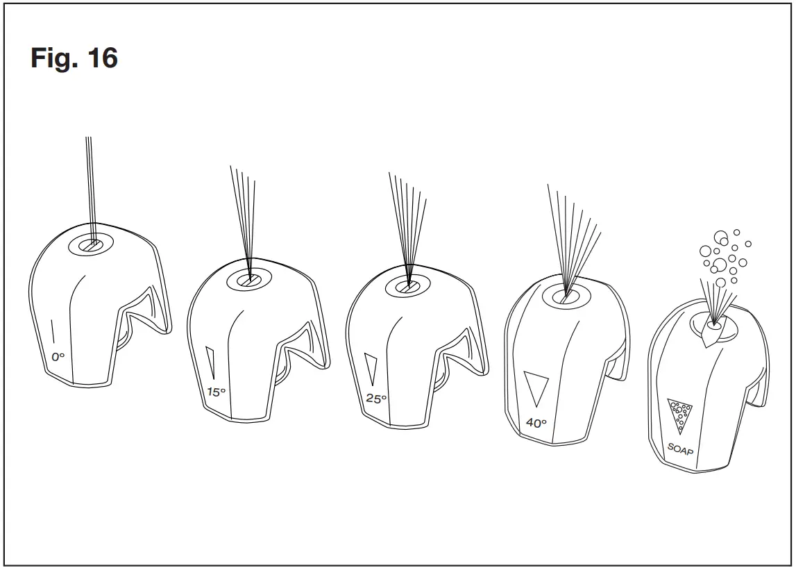 V) Use the Soap nozzle (black) for low-pressure detergent application to clean equipment, remove mildew and oxidation stains from houses, clean bricks or degrease grimy surfaces.
