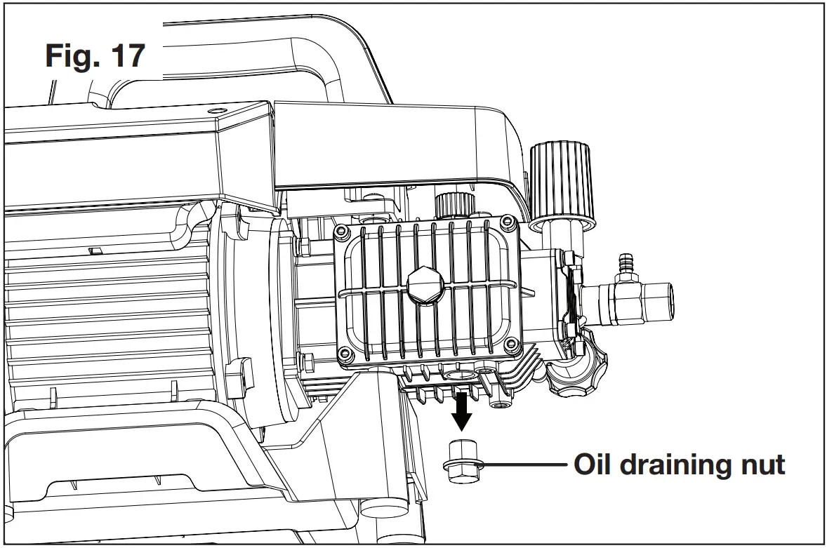 - Place a container under the pump for waste oil. Use a wrench to loosen and remove the oil draining nut located at the bottom of the pump (Fig. 17).
