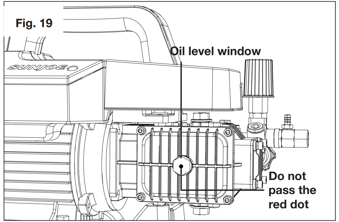 NOTE: If the oil is less than MIN, please add the oil and check the oil level through the oil level window on the side of the pump, until the oil reaches the red dot on the window (Fig. 19).