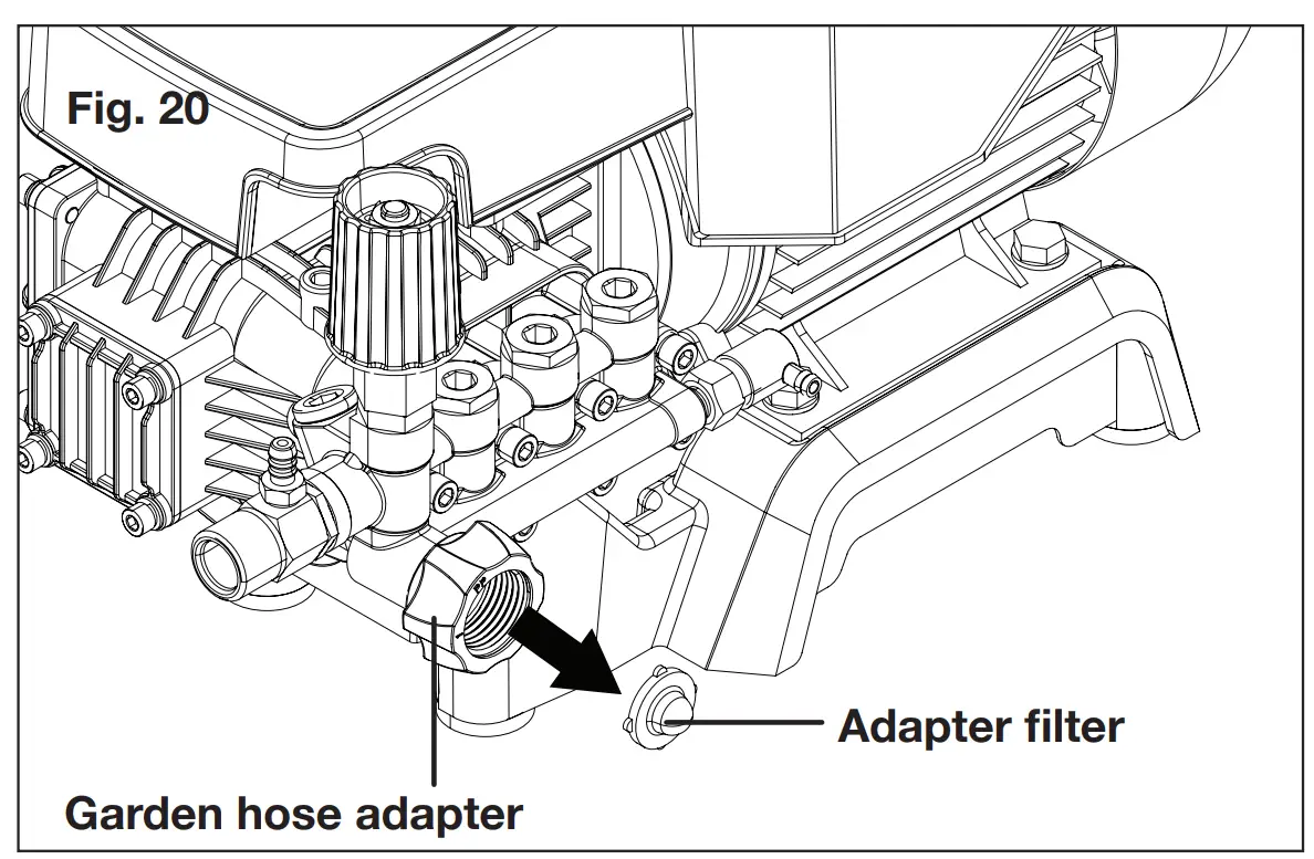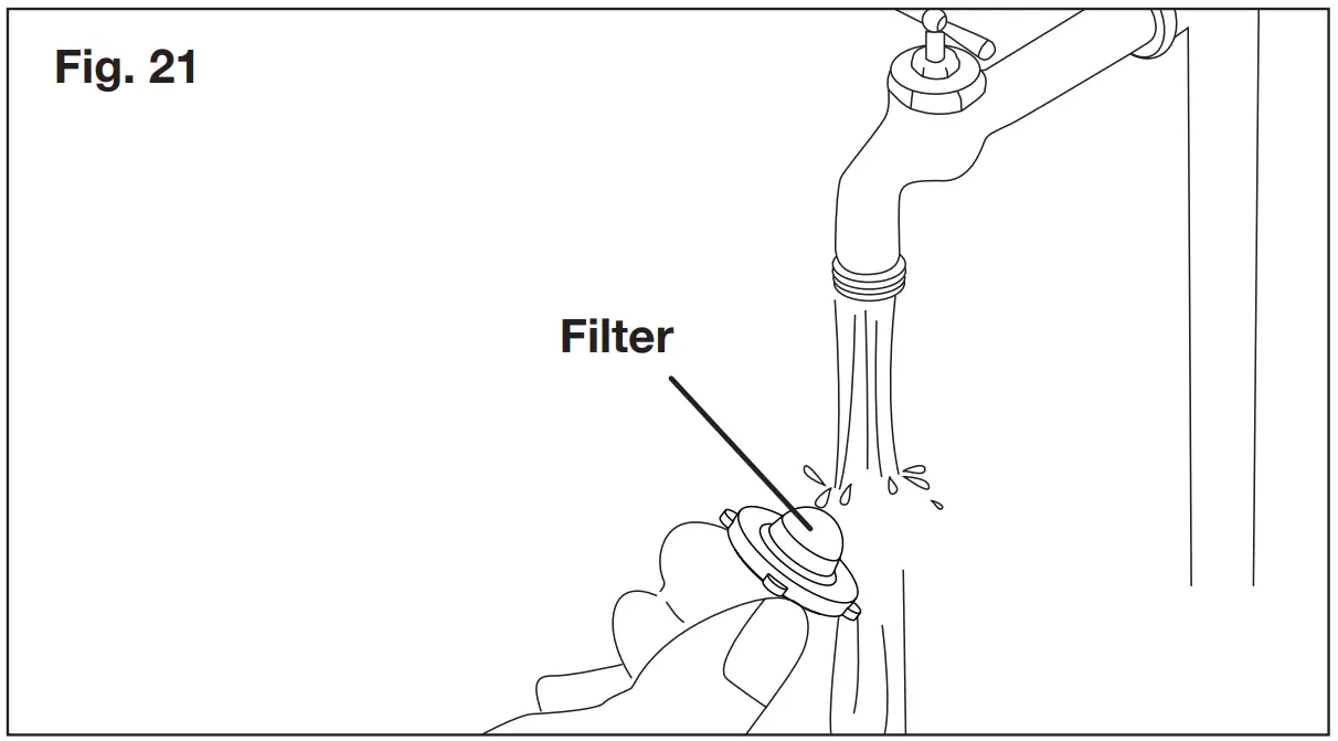 - To ensure good performance, check and clean the adapter filter (Fig. 20). Remove the filter and rinse with warm water to prevent any foreign matter from clogging the pump (Fig. 21).