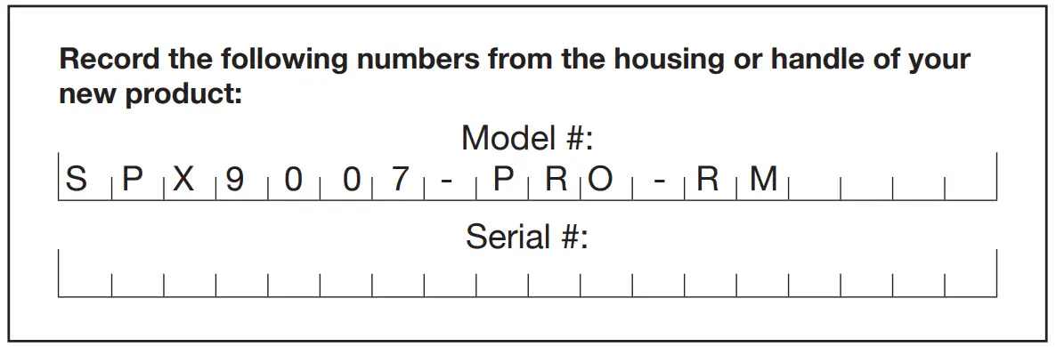 When contacting the company, reordering parts, or arranging service from an authorized dealer, you will need to provide the model and serial numbers, which can be found on the decal located on the housing of the unit. Copy these numbers into the space provided below.