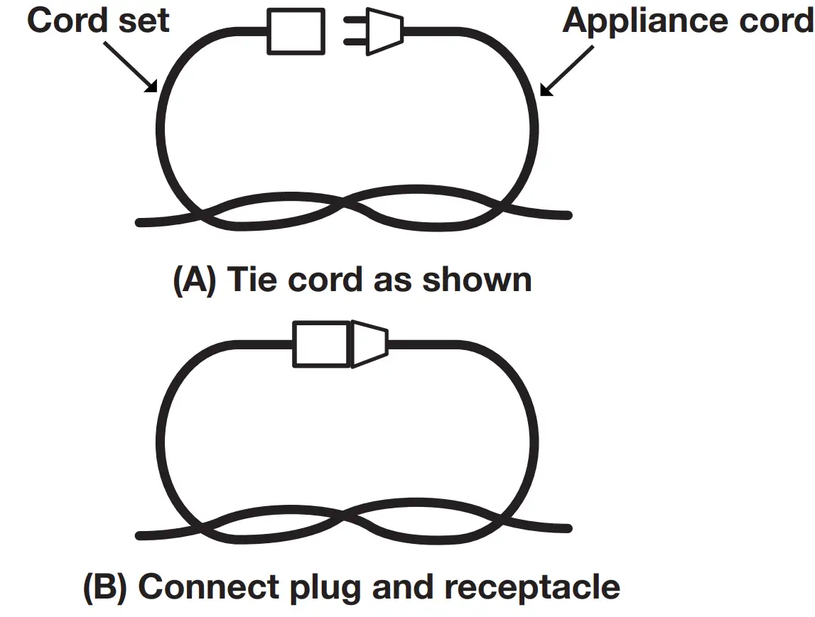 WARNING! To reduce the risk of electrocution, keep all connections dry and off the ground. Do not touch plug with wet hand. - To prevent the appliance cord from disconnecting from the extension cord during operation, make a knot with the two cords as shown in Table 1.