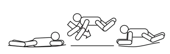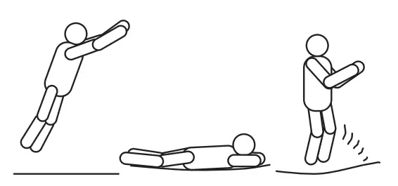 - Land in prone position by return to standing position by pushing up with hands and arms.