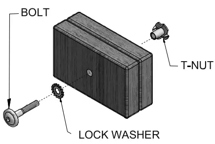 Tap T-nut into the provided hole. Insert your bolt through the lock washer and insert into the provided hole opposite from the T-Nut. Turn clockwise to thread into T-nut. Do not completely tighten until instructed.