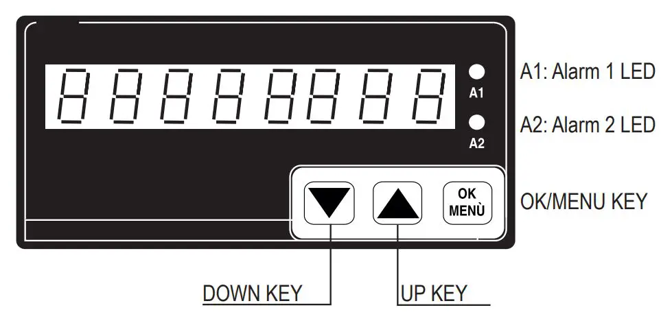 1. Type 0: both frequency value and totalizer value display. Pressing UP for a few seconds you access the frequency display, pressing DOWN for a few seconds displays the totalized value. When passing to the frequency value for a few seconds the writing appears, passing to the totalized value the writing appears for a few seconds.