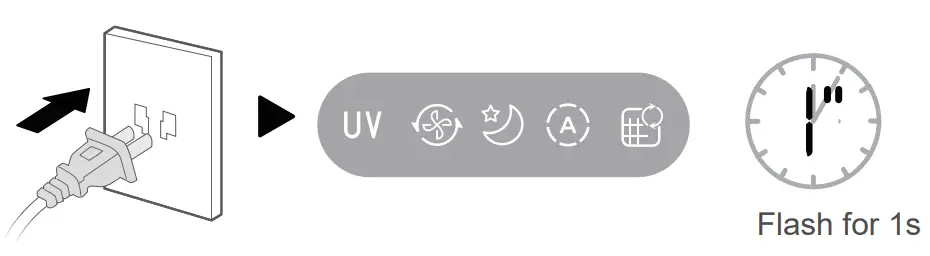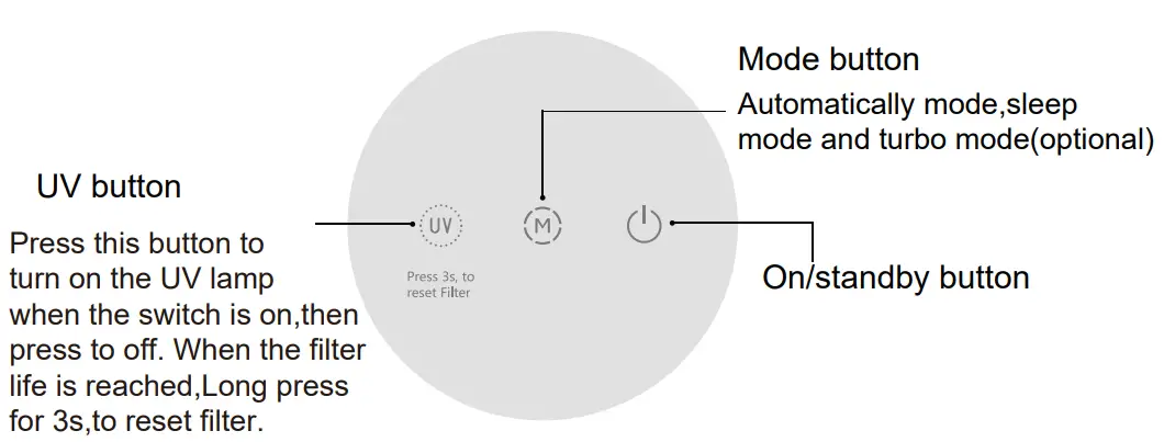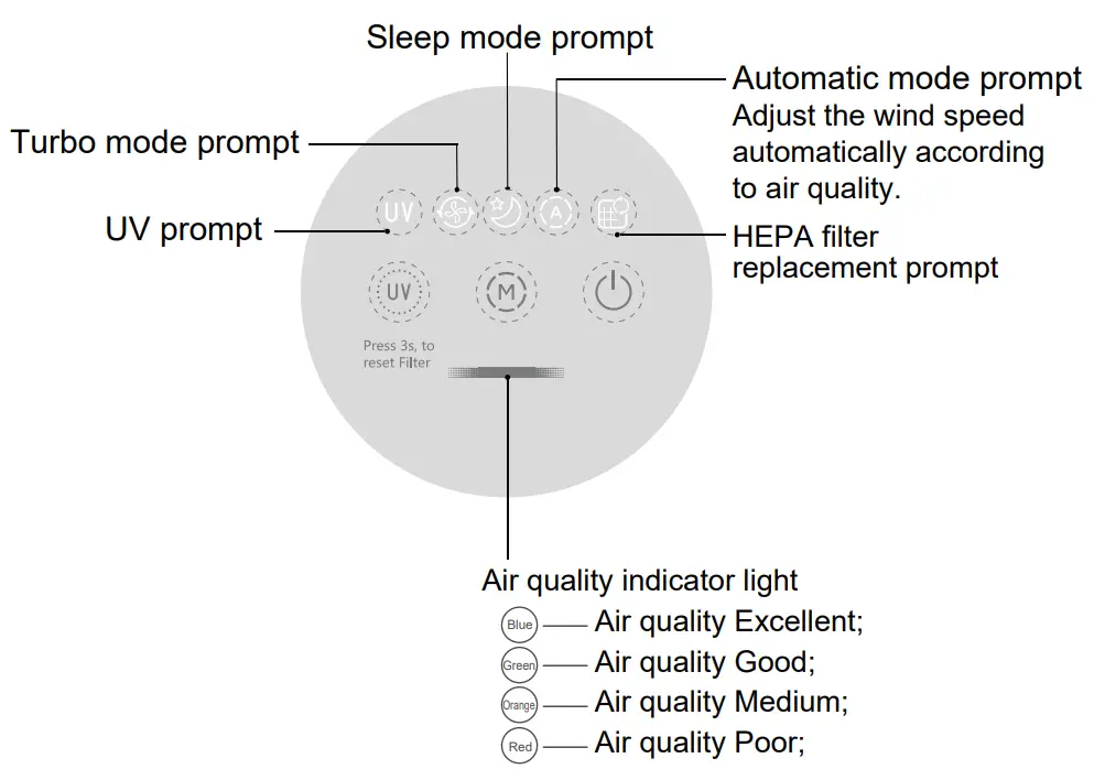 - Long press UV prompt button for 3s, reset the HEPA filter.