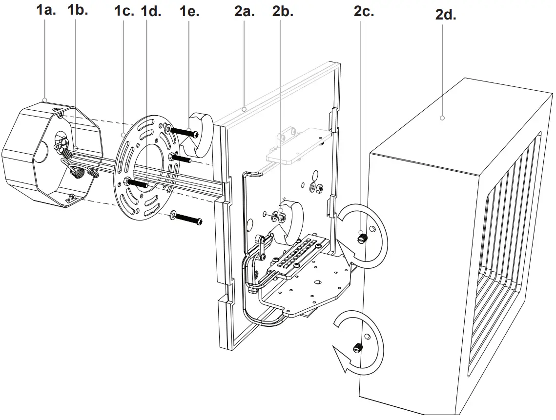 - Attach the canopy backplate (2a) to the mounting plate (1c), which is attached to the electrical junction box (1a) on the wall. First attach all wiring (1b) with the provided marrets (white to white “N”, black to black “L”, ground to ground “G”). Now secure the canopy backplate (2a) onto the mounting plate (1c) using the two nuts (2b). Thread the two nuts clockwise onto the tow backplate screws (1d). With the canopy backplate seated on the mounting plate, secure the fixture cowl (2d) with all four set screws (2c) turning clockwise.