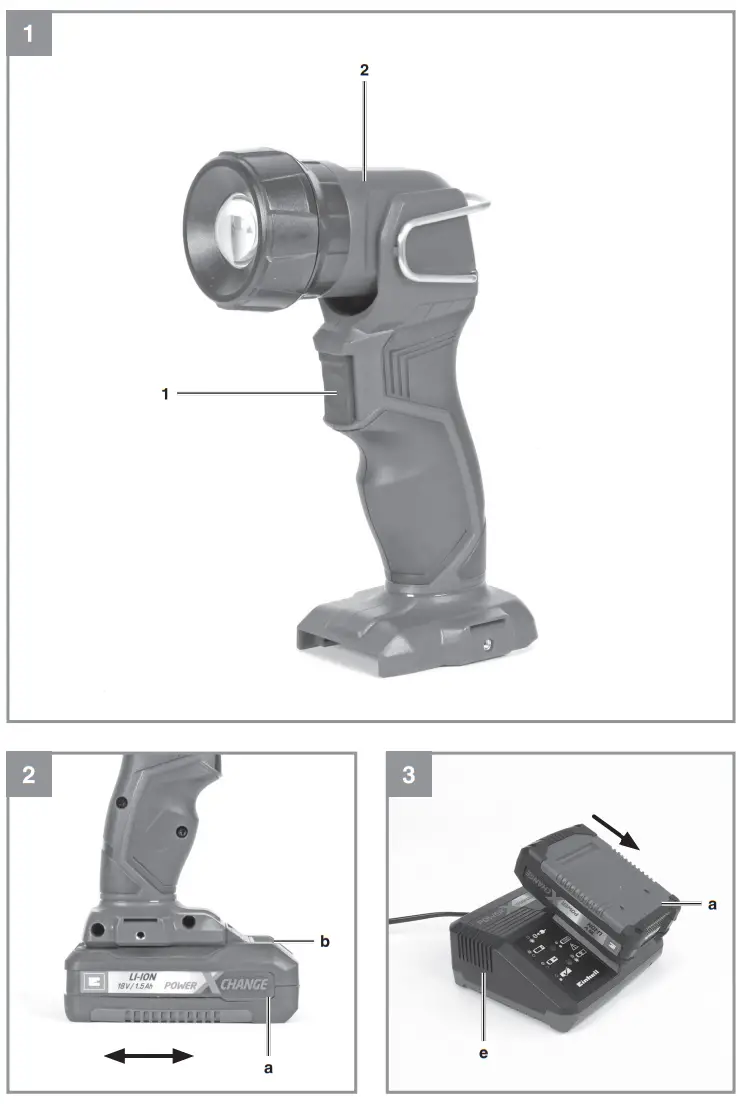 - Check that your mains voltage is the same as that marked on the rating plate of the battery charger. Insert the power plug of the charger (e) into the mains socket outlet. The green LED will then begin to flash.